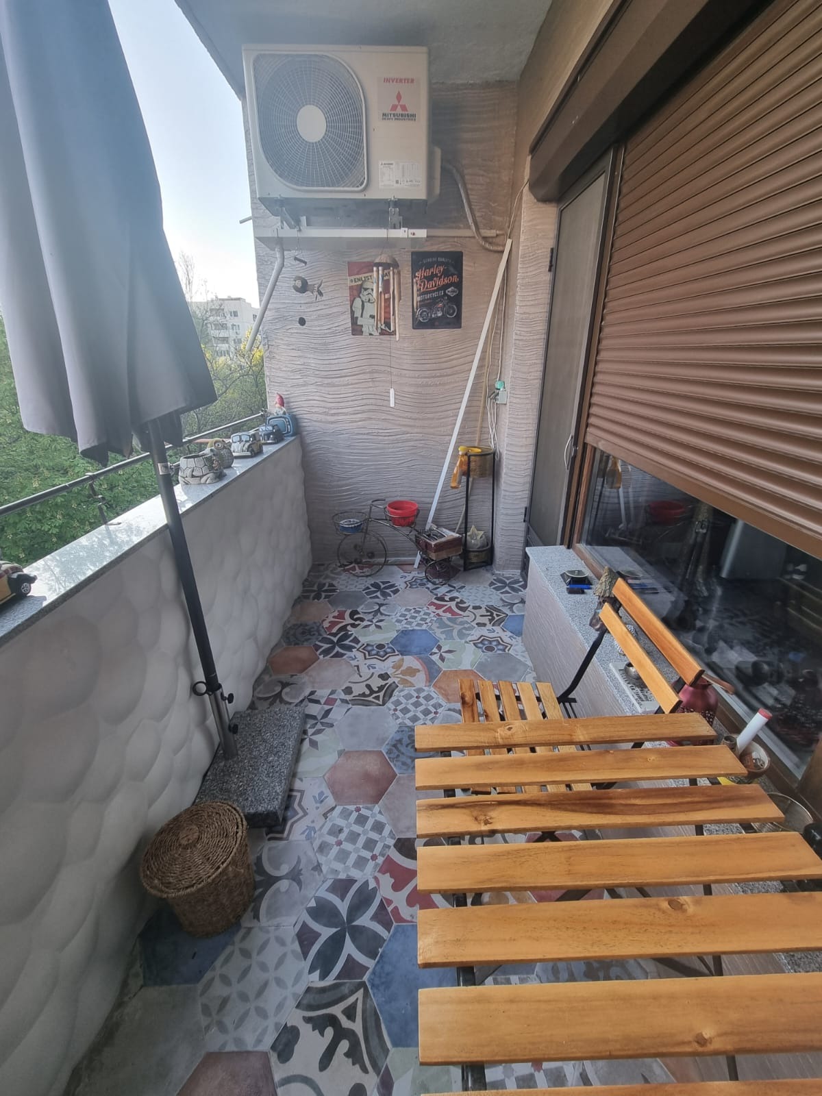 Обзаведен, с инверторен климатик, алуминиева външна ролетна щора с дистанционно