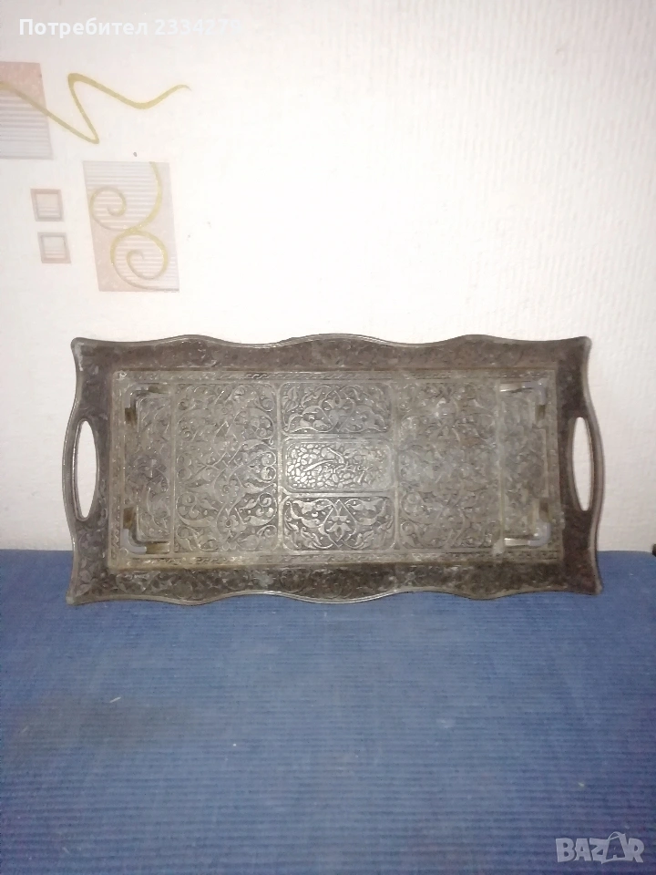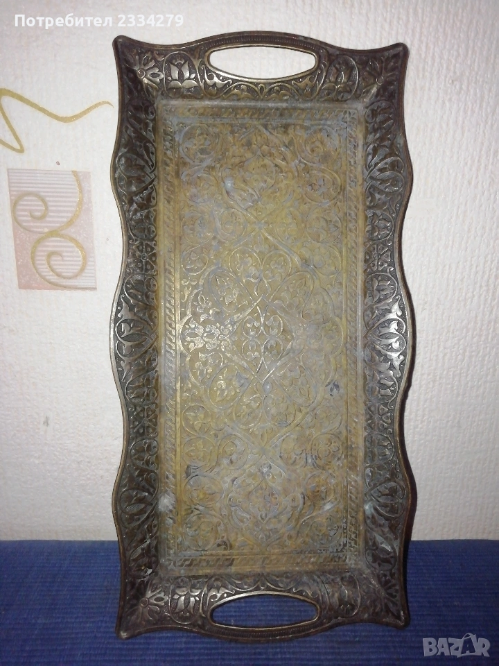 Стари подноси от различни времена, държави, автори. N:1 стар бронзов турски поднос размери 23х16см.,изцяло орнаментиран, масивен, цена 10€.; N:2 антикварен дървен поднос декориран с техника маркитерия и интарзия, дърво с декоративна инкустации, размери 40х28см., цена 17€.; N:3 стар поднос орнаментиран от метал и порцелан, флорален стил, началото на 20век, Чехословакия, размери 49х30см., цена 17€.