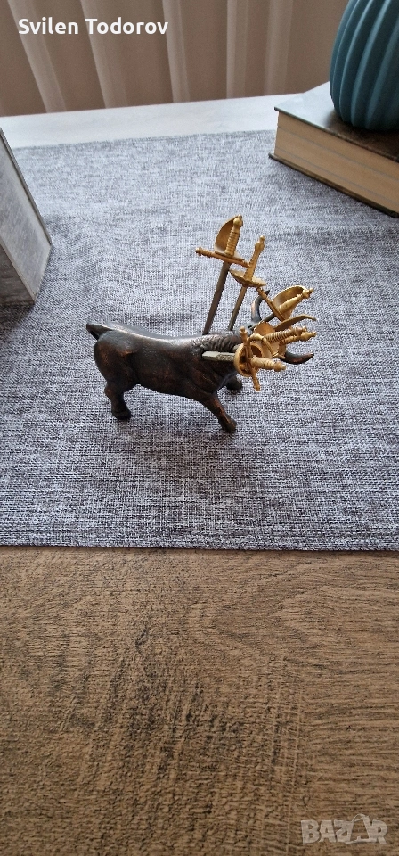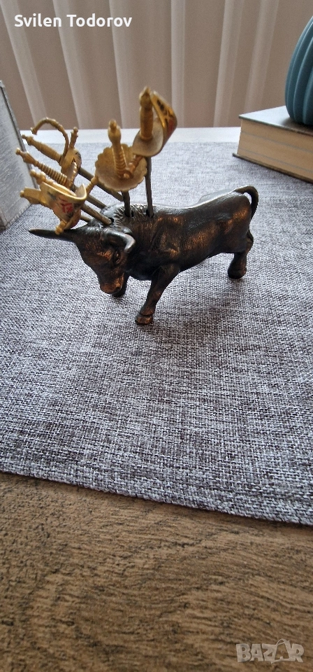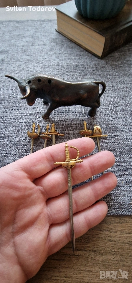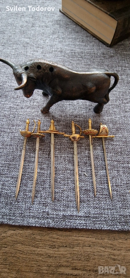 Статуетка на бик Толедо в отлично състояние,материал бронз или месинг. Метални шпаги за коктейл.Получавате това,което е на снимката.