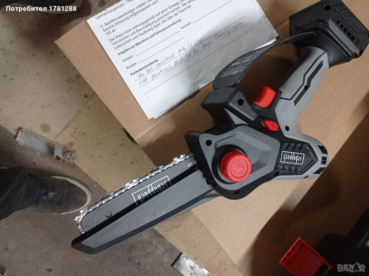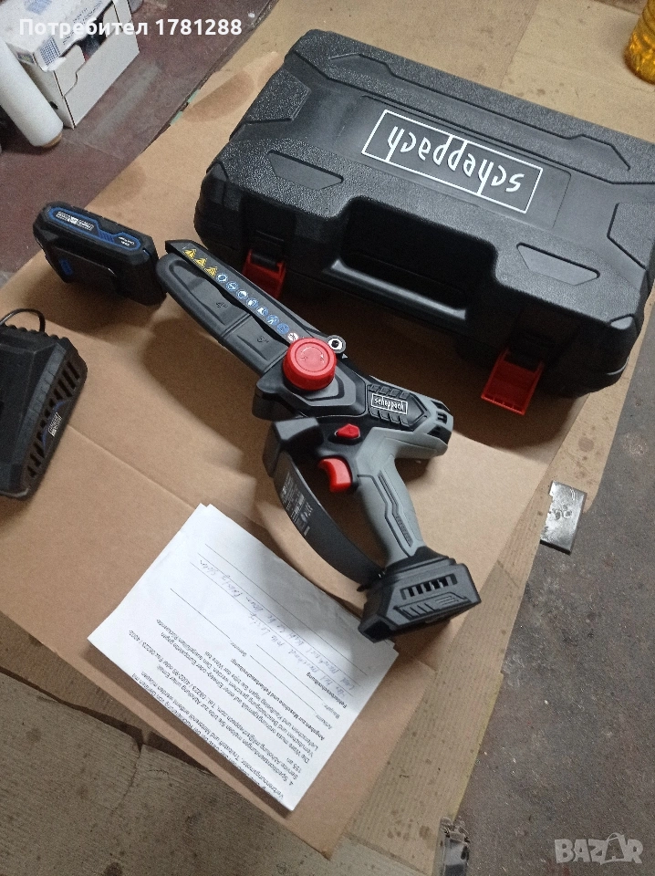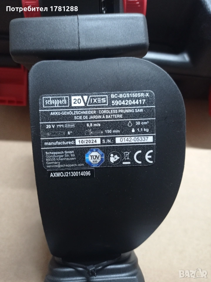 Акумулаторен трион за рязане на клони и дървета с автоматично смазване на веригата, немско производство 2024г. техническите данни са видни на снимката.