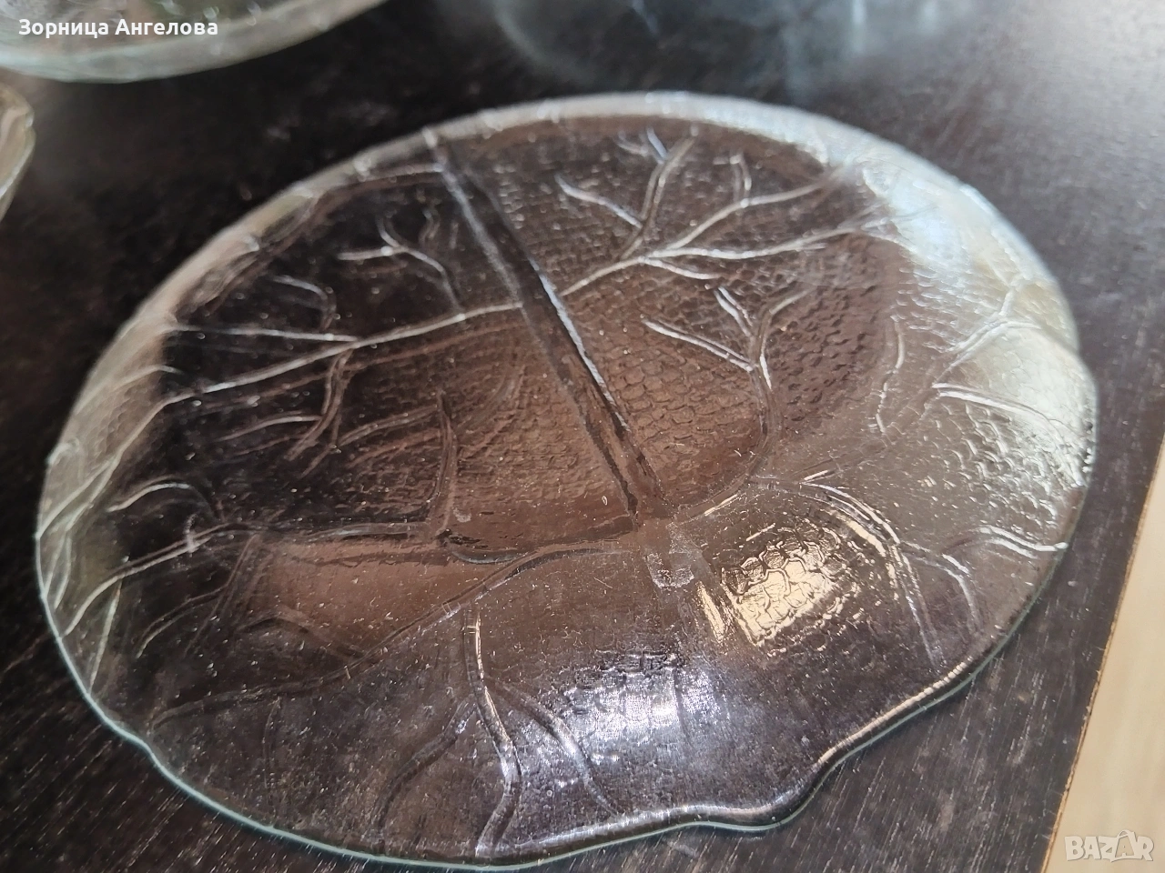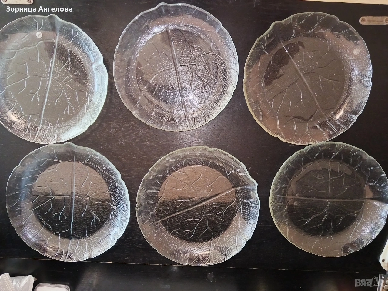 Комплект 6 стъклени чинии с релеф „листо“. Не са ползвани. Диаметър 19 см. → Обява 53663264