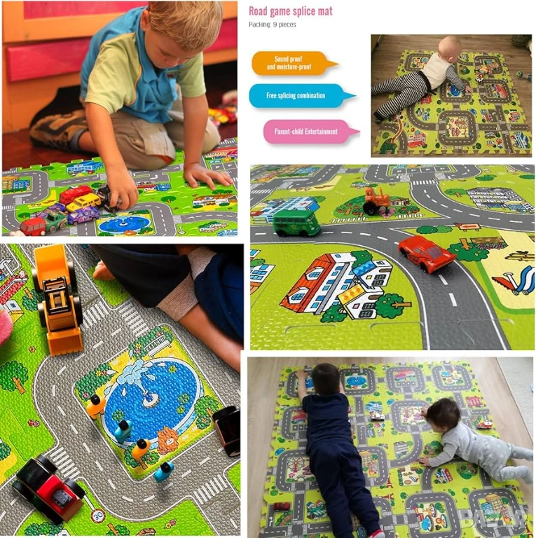 Килимът се състои от 4 големи плочки. Сглобете ги, за да получите меко килимче с неплъзгаща повърхност, идеално за игра върху него. Водоустойчиво, лесно за почистване и съхранение, и с отлична изолация, то е най-страхотния подарък за весели игри на пода!