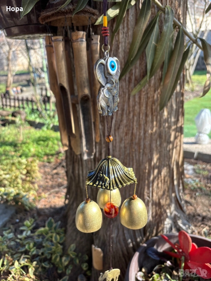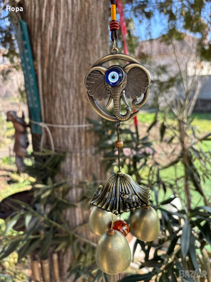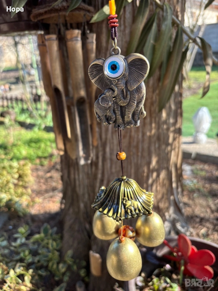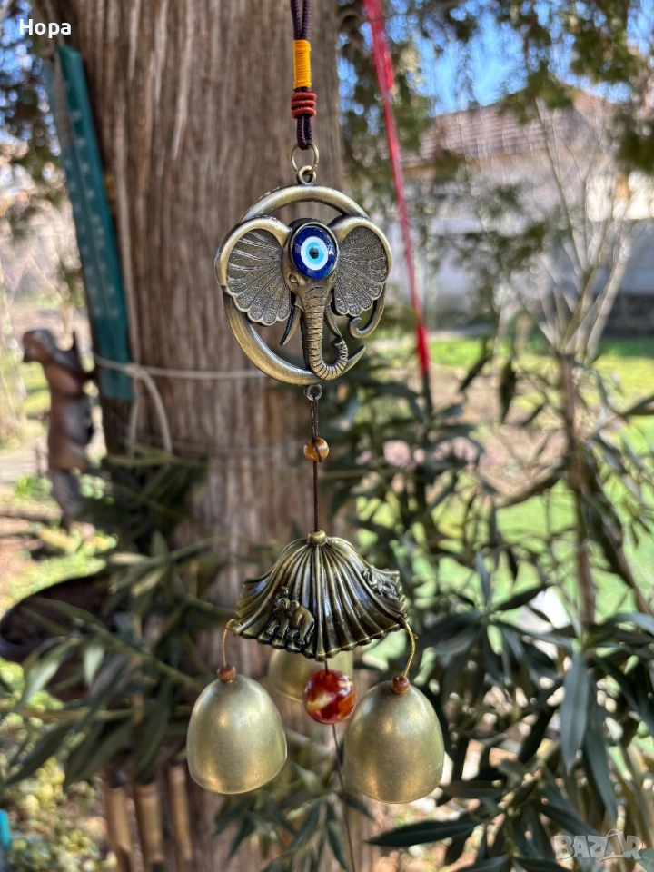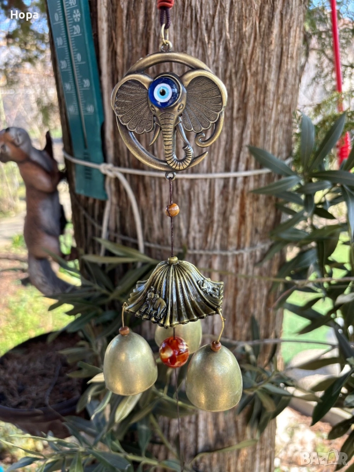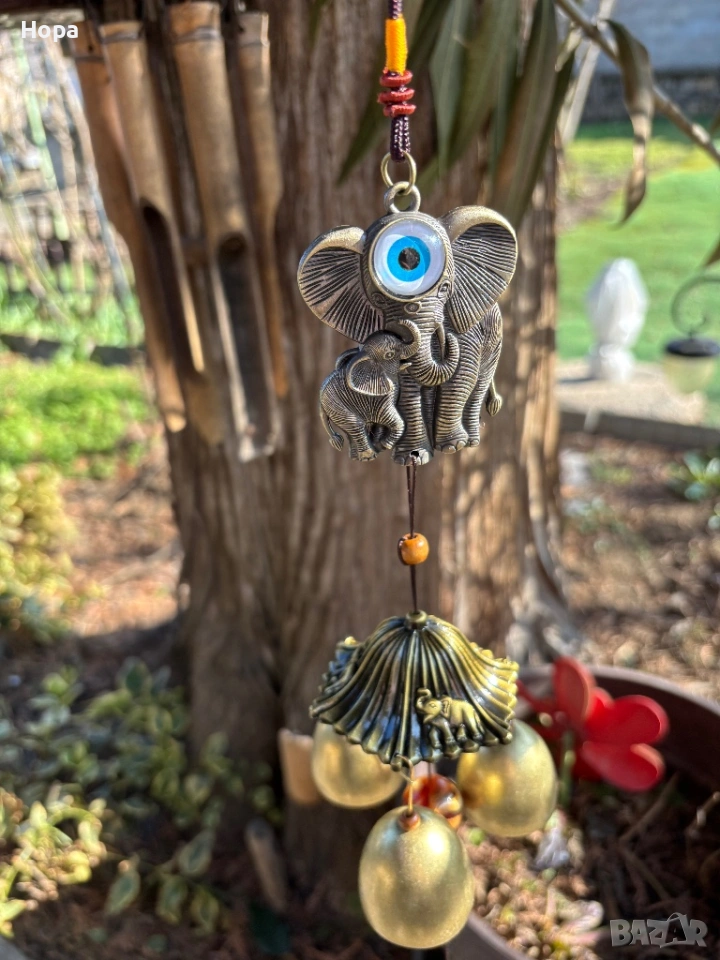 🐘🔔 Фън Шуй метален вятърен звънец със слонче и окото на Назар 🧿