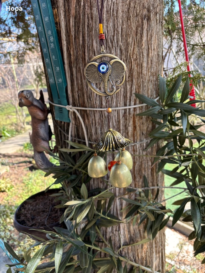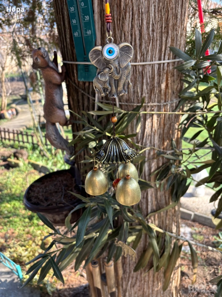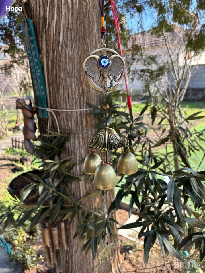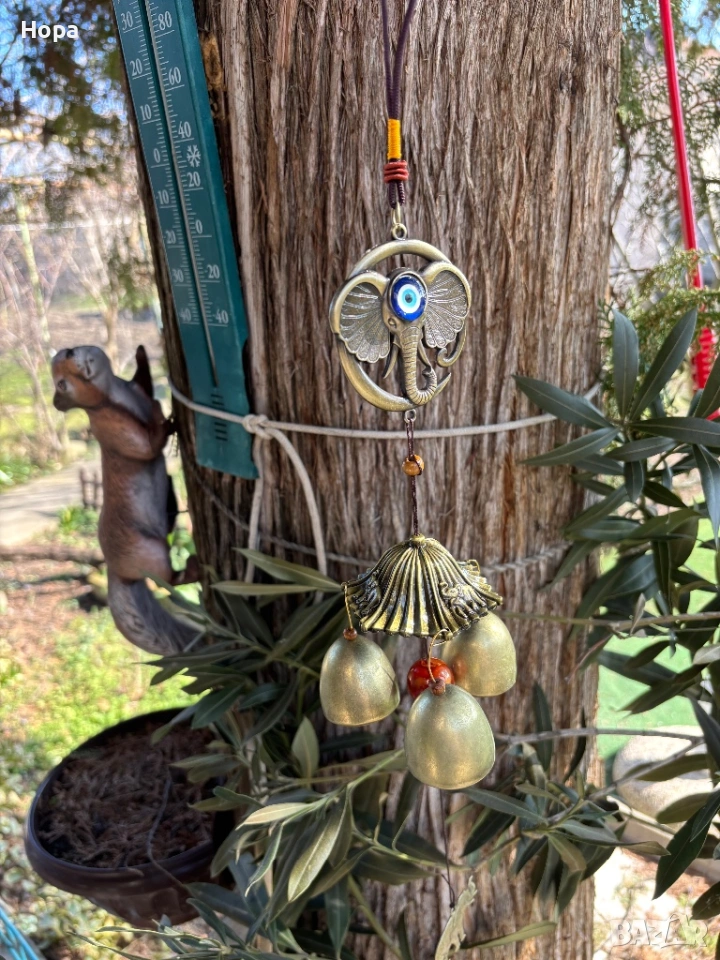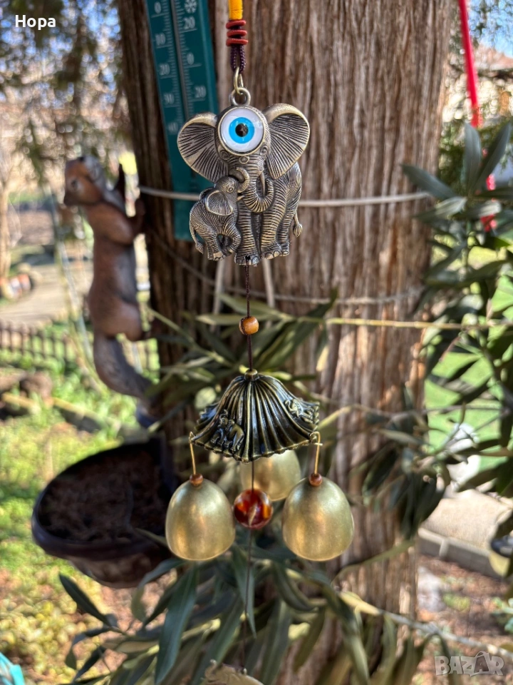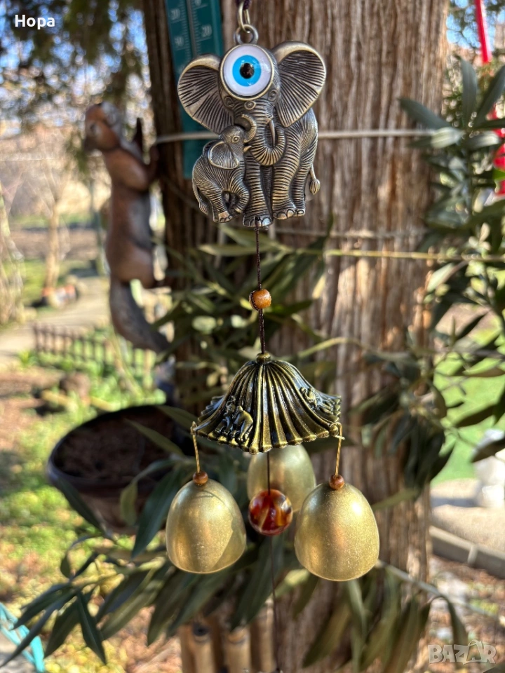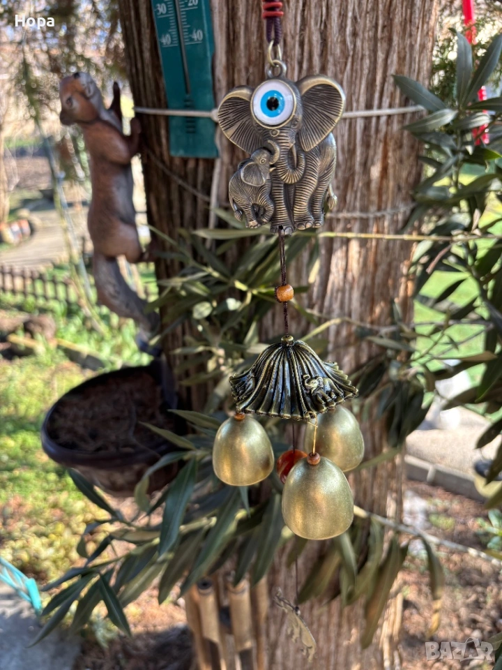 🐘🔔 Фън Шуй метален вятърен звънец със слонче и окото на Назар 🧿