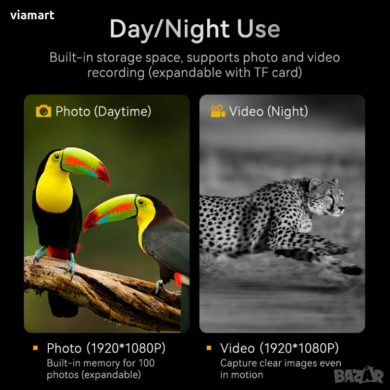 Дигитален бинокъл за нощно виждане INSKAM 328 е практичен избор, когато ти трябва реална видимост в тъмното, без да разчиташ на външна светлина. В пълна тъмнина работи с IR подсветка 850 nm (7 степени) и достига до 800 м обхват, а през деня дава цветна картина. Устройството записва Full HD 1080p видео и прави снимки, така че можеш да запазиш наблюденията си и да ги прегледаш на място на 2.8” IPS екран. Подходящо е за лов, охрана на обекти, риболов и наблюдение на диви животни - когато дистанцията и детайлът са решаващи.