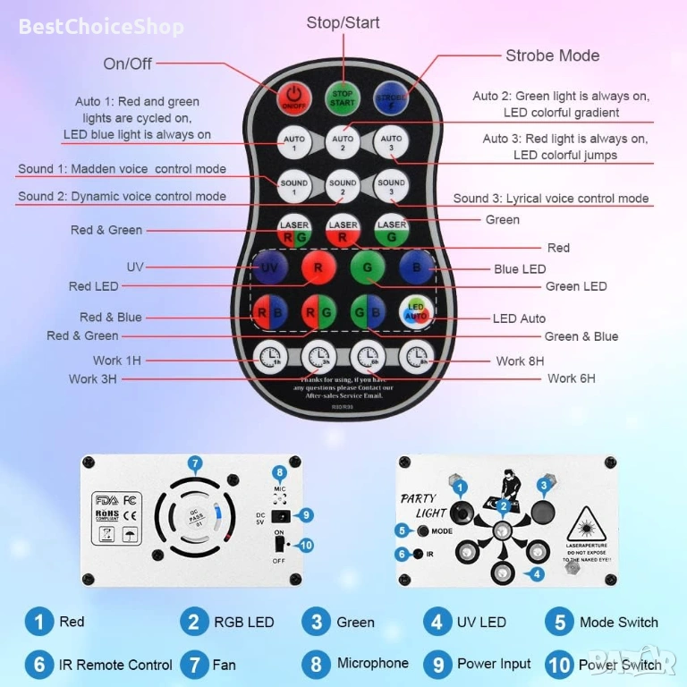 - 🌞【Подобрено дистанционно управление】Мини DJ диско светлината може да контролира 3 автоматични режима и 3 режима, активирани със звук, режим на стробоскоп, настройка на времето (1/3/6/8 часа). Много е удобна за употреба, разстоянието е над 6 метра. Изберете ефекта на сценичното осветление, както желаете, за да създадете по-мечтана атмосфера.