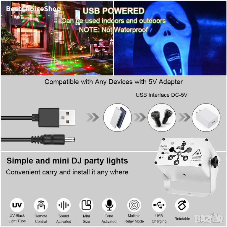 - 🎄【USB захранване】Сценичната лампа е изработена от висококачествен алуминиев корпус, има вграден издръжлив охлаждащ вентилатор, новаторска е и лека. Предлага се с 2-метров USB кабел за по-малко ограничения и повече удобство. Диско лампата може да се захранва от 5V1A зарядно за стена, външна батерия, компютър, лаптоп, зарядно за кола и др.