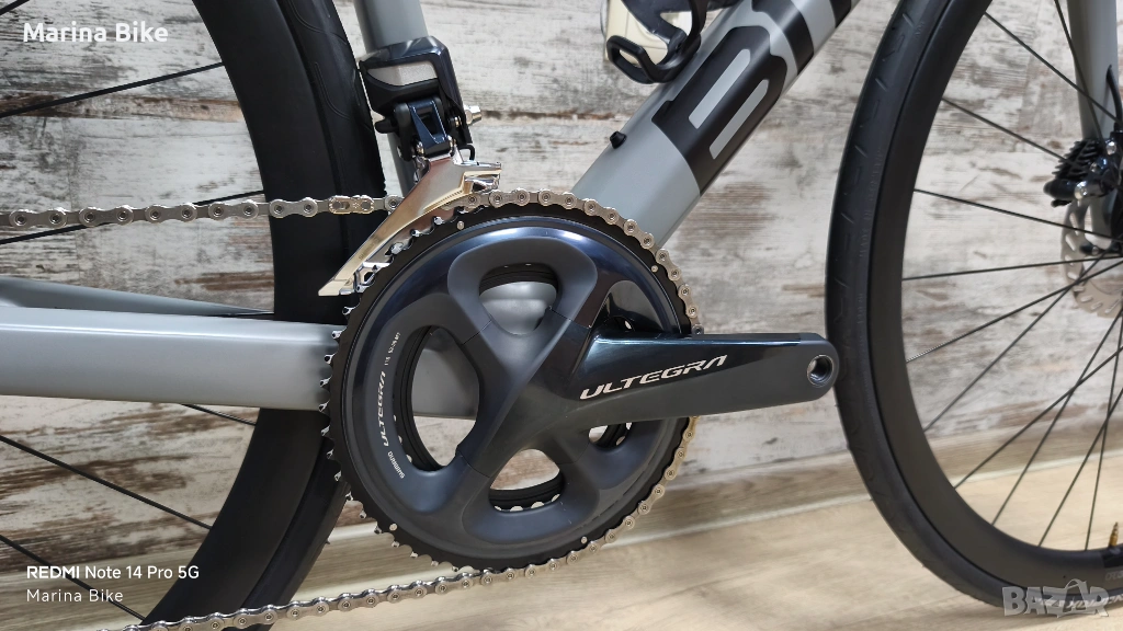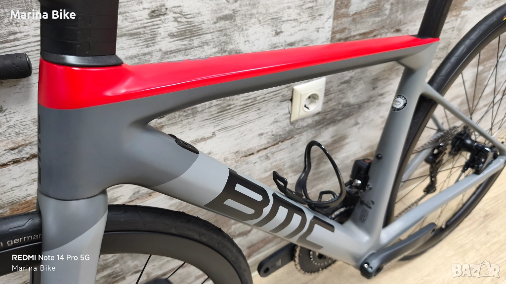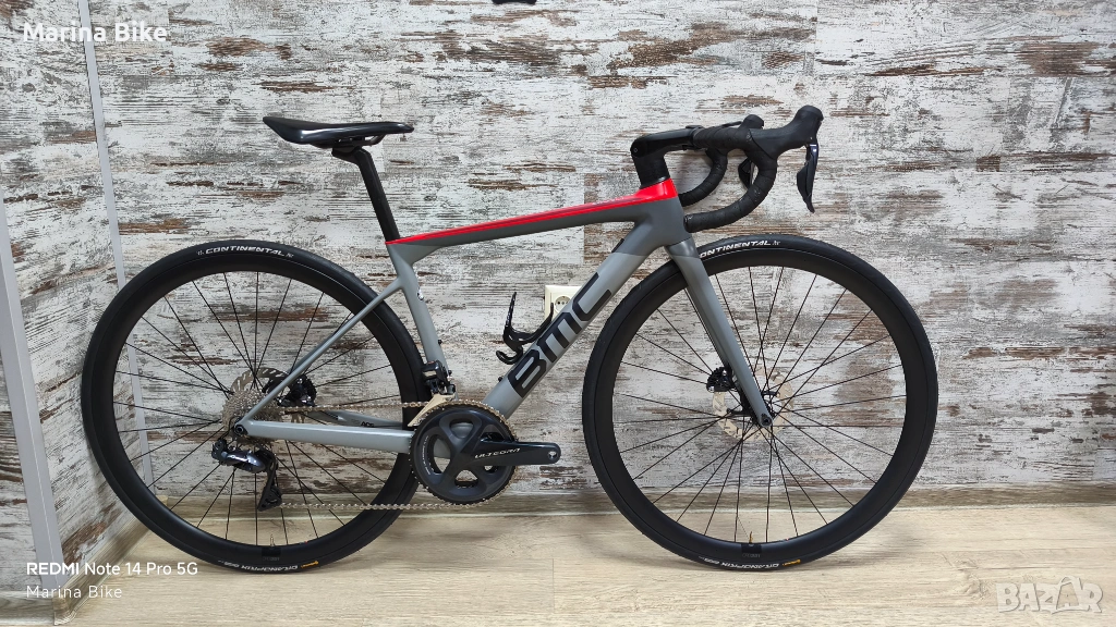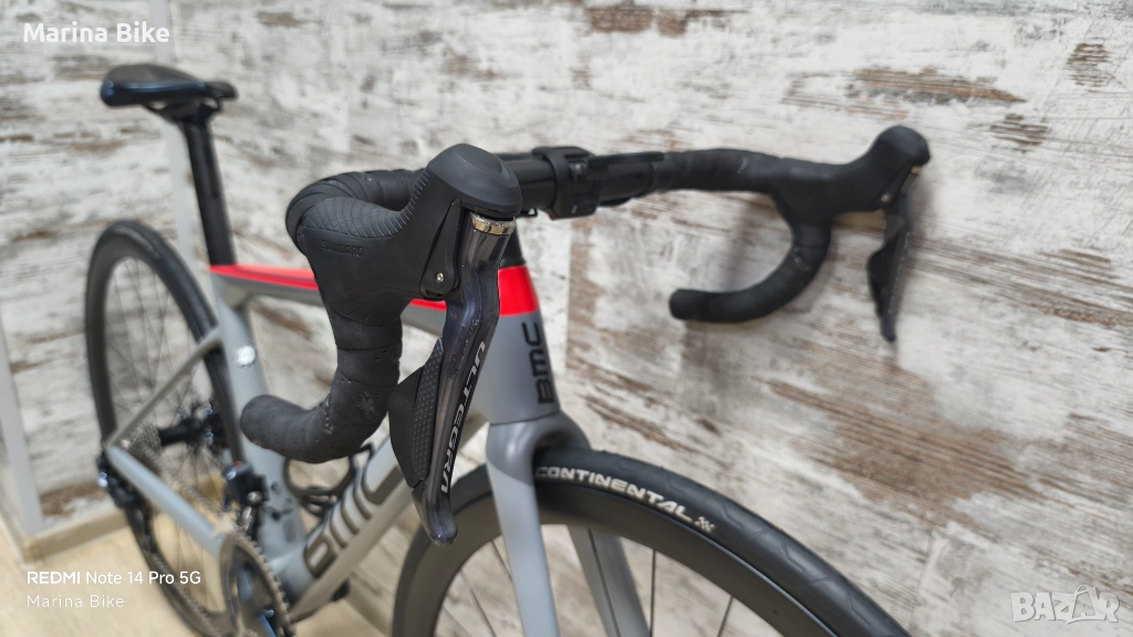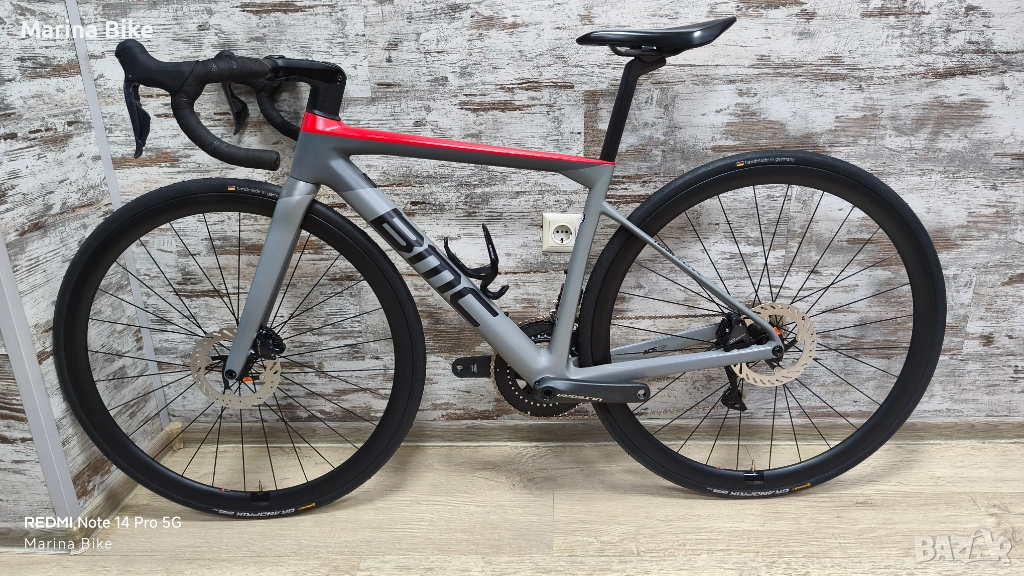 Велосипедът е в изцяло фабрична сглобка, оборудван с пълен електронен монтаж 2х11 скорости Shimano Ultegra R8070 Di2, карбонови капли BMC CRD351 със чисто нови гуми и карбонова седалка.