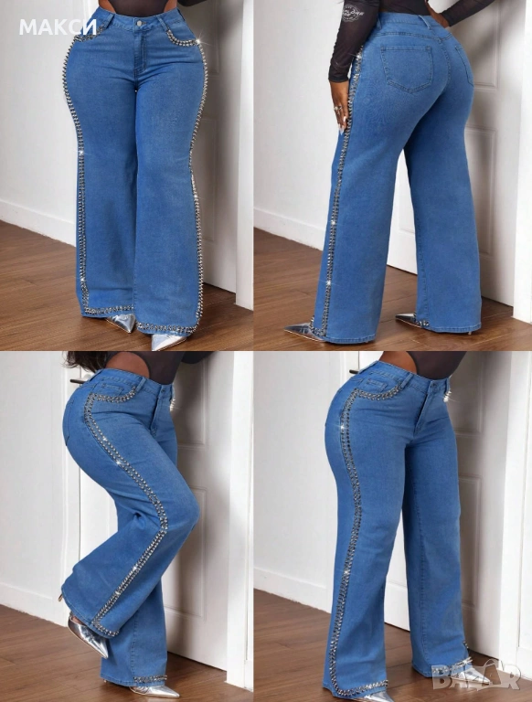 Модерни макси силно еластични дънки с висока талия, метален цип+копче, 5 бр. джобове, широки крачоли → Обява 53664623