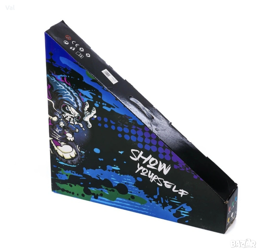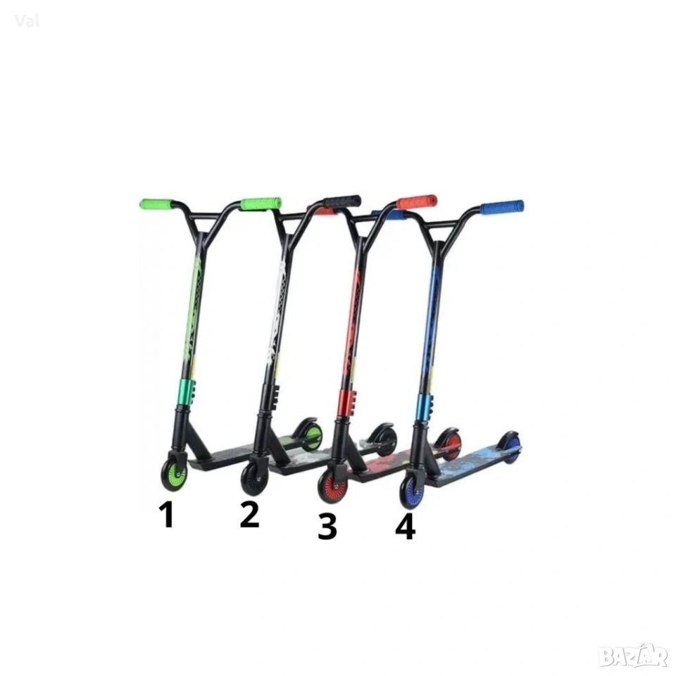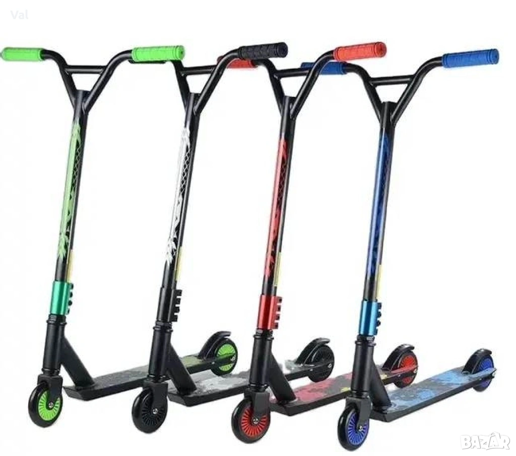 Тротинетка за трикове с метална спирачка и гумени ръкохватки.