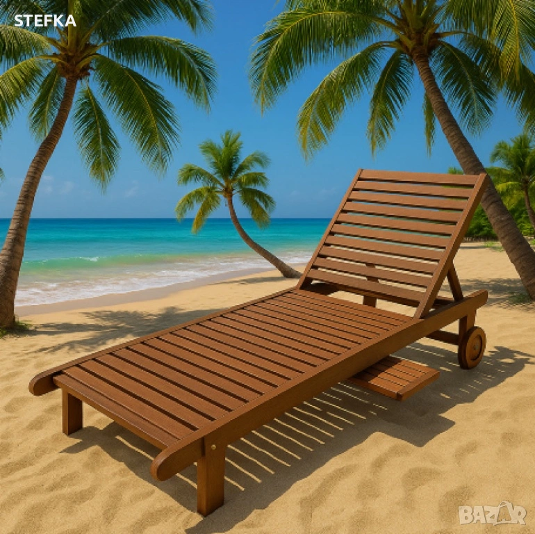 Шезлонгът е с класически, линеен дизайн, изцяло изработен от естествено дърво с обработка от тиково масло за допълнителна защита. Дървесната структура е умерено груба с видими преплетени зърна, което придава автентична текстура и натурална естетика.