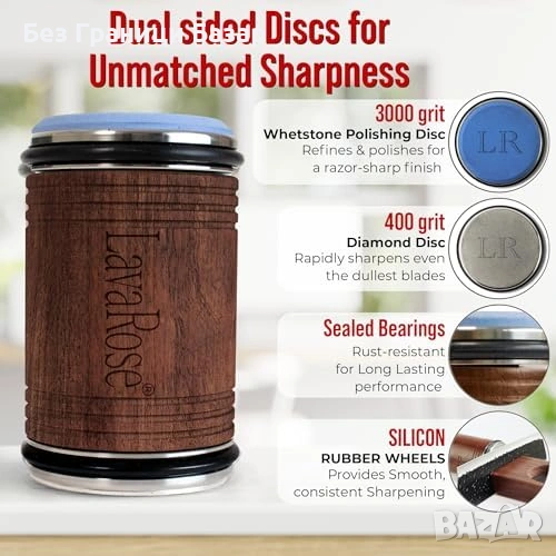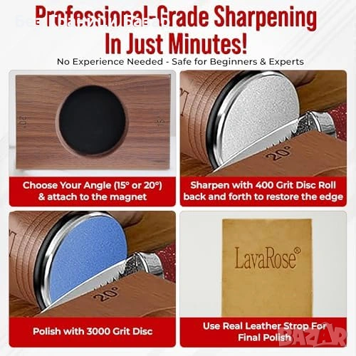 Сменяеми дискове: диамантен (400 grit) за възстановяване на затъпени остриета + 3000 grit за фино заглаждане