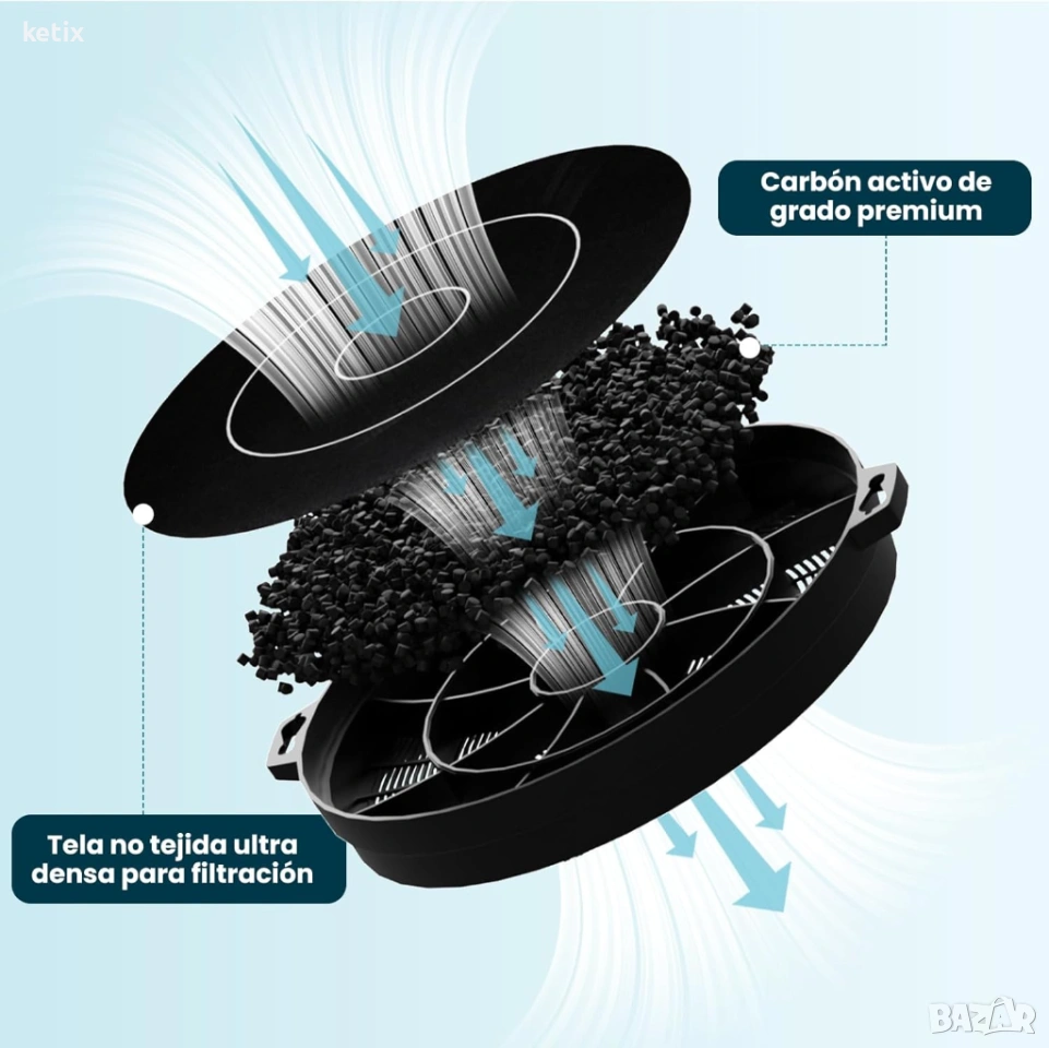 Двоен филтърен ефект: подобреният неутрализиращ миризмите филтърен ефект на активния въглен е два пъти по-силен от този на конвенционалния филтър, ефективно премахва неприятните миризми, мазнините и вредните частици.