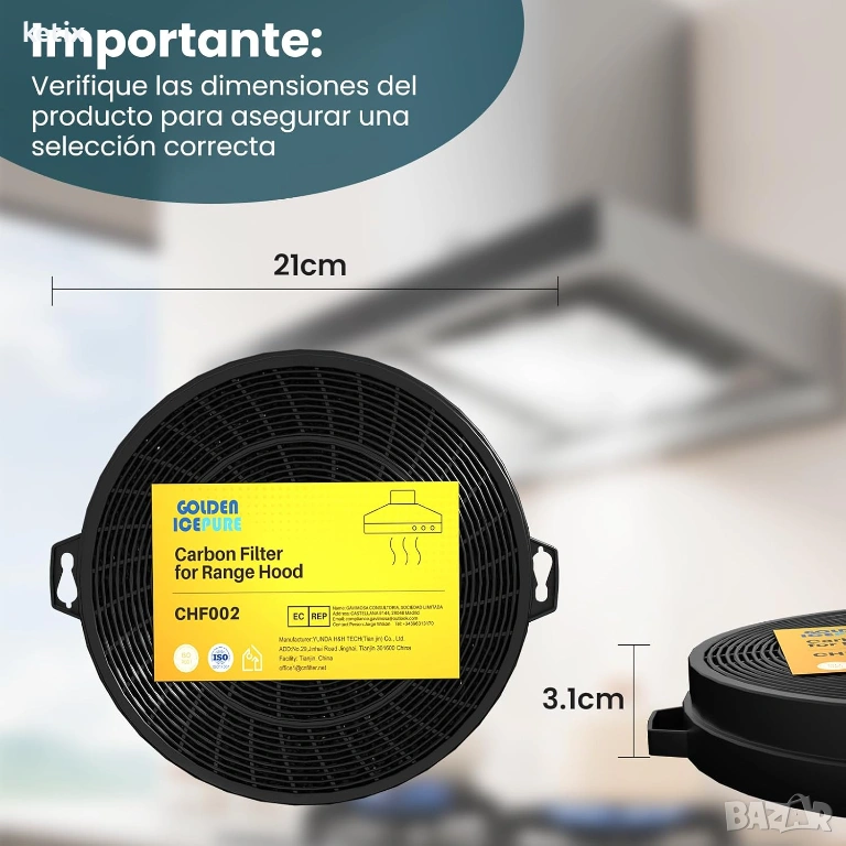 Стандартен размер: лесен за инсталиране филтър с активен въглен, размер на абсорбатора. Диаметър 210 мм. Дебелина 31 мм. Отвори за закрепване (размери на втулката: 15 мм x 40 мм).