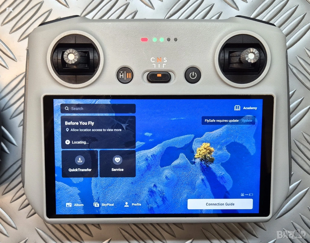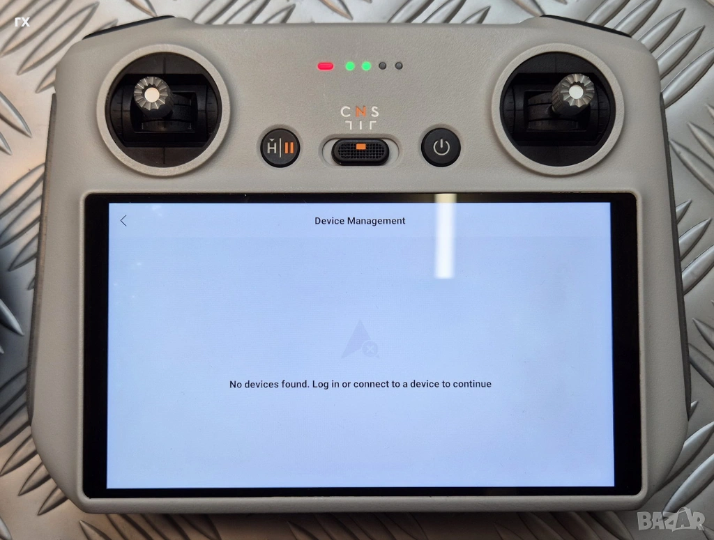 DJI RC Дистанционно: Контролер с вграден екран, леки забележки по дисплея, виждат се само на бял фон.
