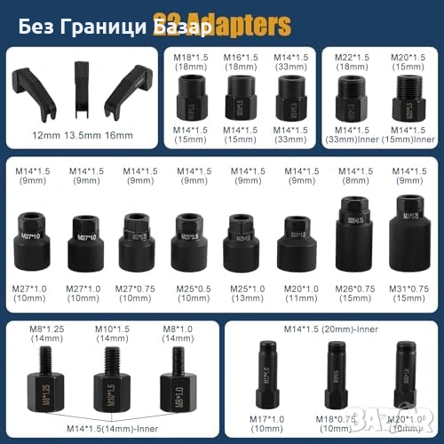 Широк диапазон адаптери и резби: 12mm / 13.5mm / 16mm + M18x1.5, M16x1.5, M14x1.5, M22x1.5, M20x1.5, M27x1.0 (x2), M27x0.75, M25x0.5, M25x1.0, M20x1.0 (x2), M26x0.75, M31x0.75, M8x1.25, M10x1.5, M8x1.0, M17x1.0, M18x0.75