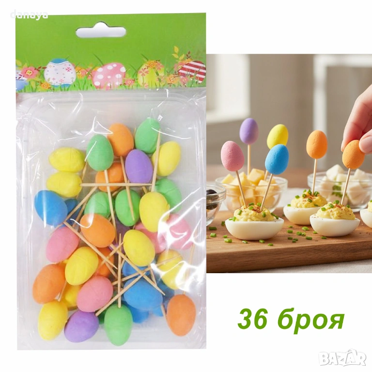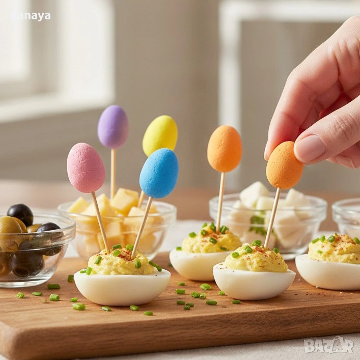 Всяка клечка е декорирана с цветно яйце, което придава завършен и весел вид на предястия, солени хапки, сирена, маслини, яйца, канапета и мини десерти. Идеални са за празнична маса, кетъринг, бюфет или домашно тържество, когато детайлите правят впечатление.