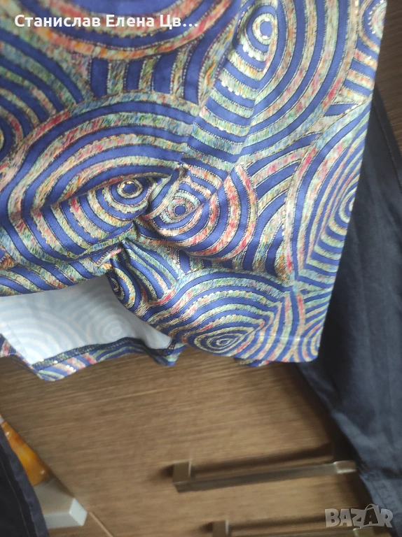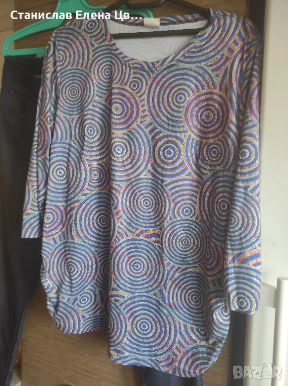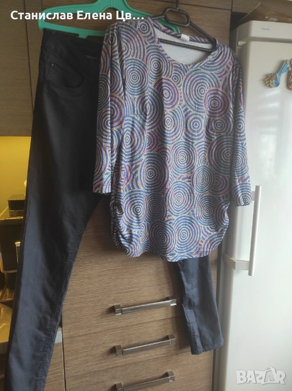 Дамски тъмносин еластичен панталон, тъничък, размер по етикет 42. Към него блузка цветна, еластична, размер по етикет 46. Като нови.