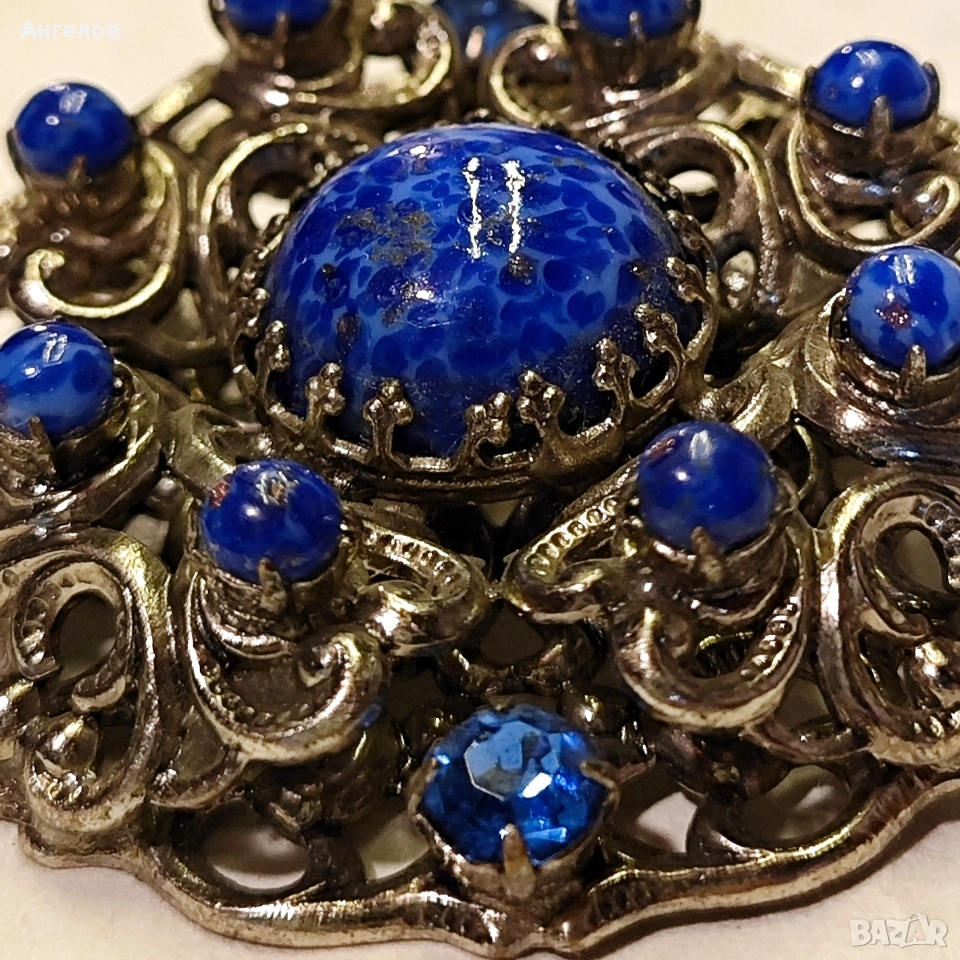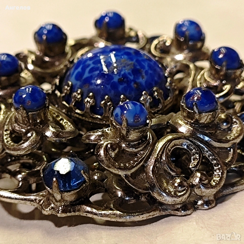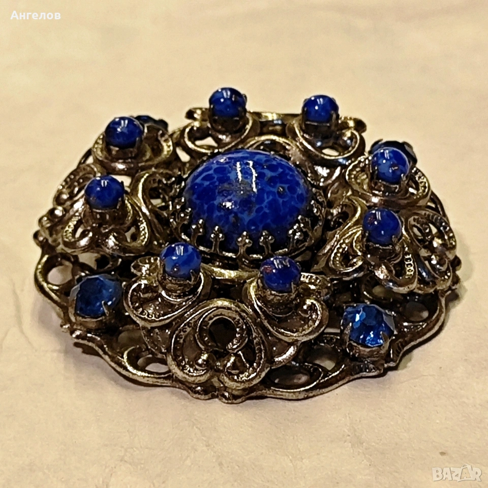 Брошка от Западна Германия 1950г. Сребрист метал в куполна форма с орнаменти и стъклени кабошони в стил лапис лазули.