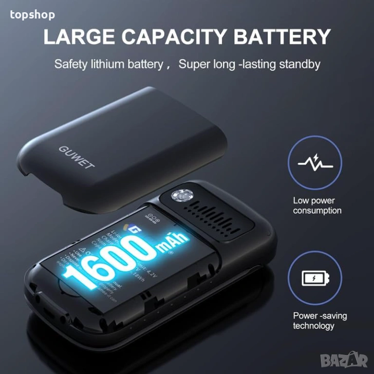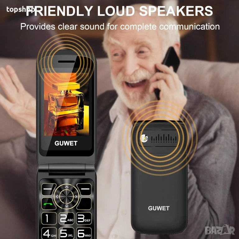 Продавам нов, отключен мобилен телефон Guwet, специално проектиран за лесна и сигурна употреба от възрастни хора. Моделът е тип "мида" с практичен дизайн с два екрана и меню на големи символи.
