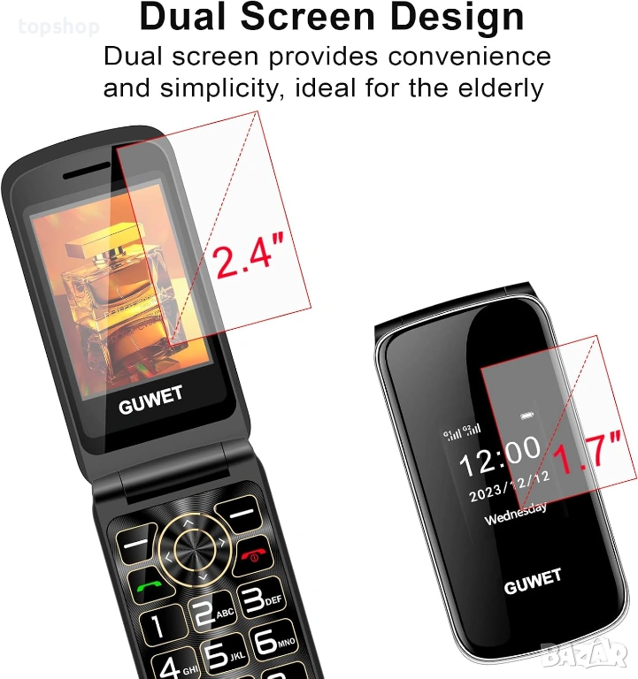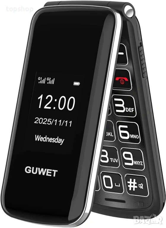 Нов мобилен телефон за възрастни с два екрана Guwet с Големи бутони + SOS бутон