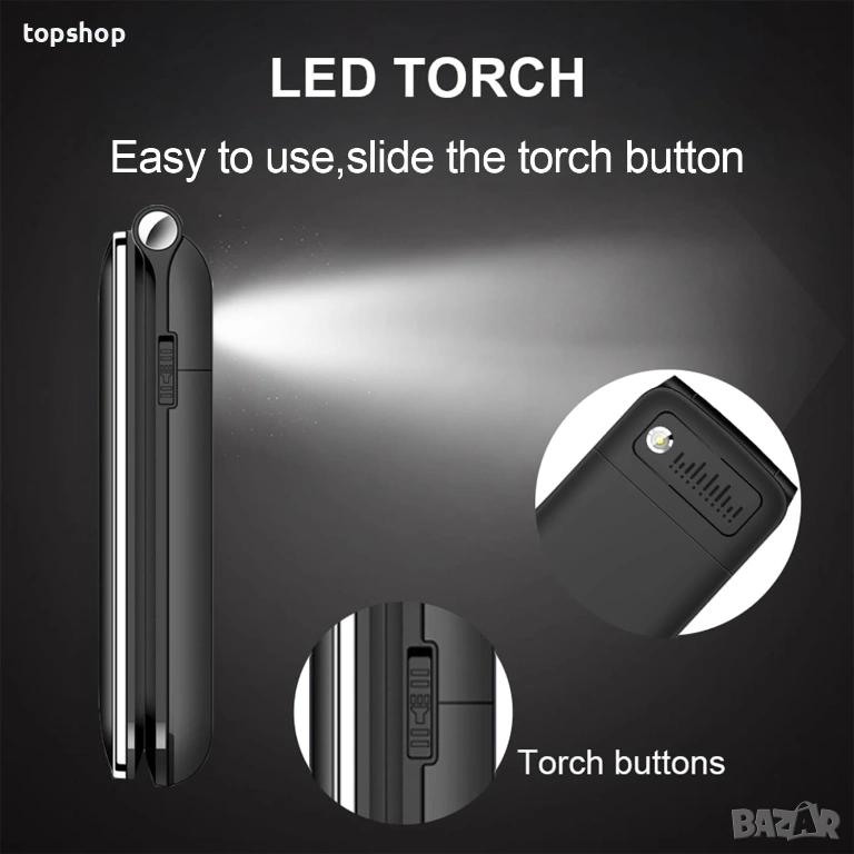 Лесна употреба: Големи, удобни бутони, силен звук и вградено фенерче.