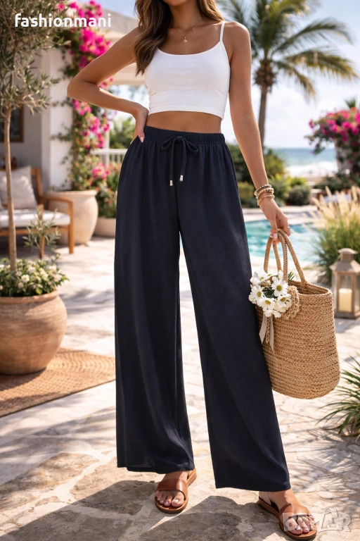 Панталон подходящ за небрежно-елегантна визия с еластичен колан и допълнен от декоративни връзки, без странични джобове.