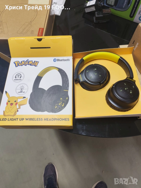 🎨 Дизайн: Черни слушалки с жълти акценти и графика на Пикачу.