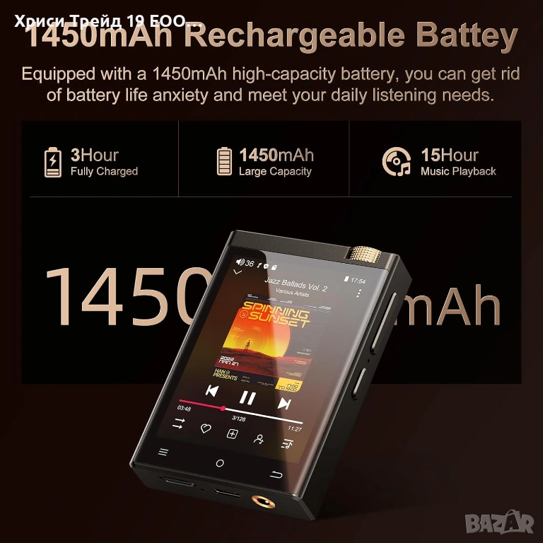 Батерия: Голям капацитет, осигуряващ часове непрекъснато Hi-Fi слушане.