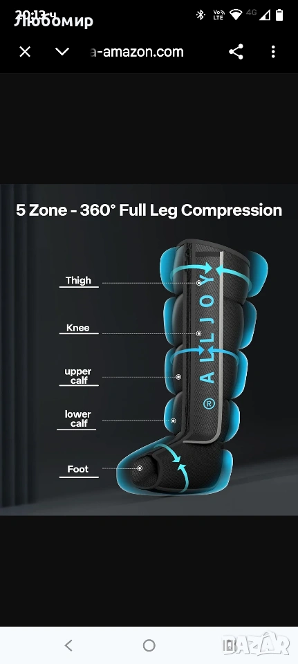 ИНОВАТИВНА 5-ЗОННА СИСТЕМА ЗА ЦЕЛЕНА ВЪЗДУШНА ТЕЧНОСТ - Разчупвайки границите на традиционните 4-камерни системи, компресионният масажор за крака ALLJOY Pro разполага ексклузивно с 5 независими зонирани въздушни възглавници. Те прецизно обхващат 5 основни мускулни групи: бедро, коляно, горна част на прасеца, долна част на прасеца и стъпало, постигайки целенасочено налягане. Независимата зонирана компресионна терапия се прилага специално върху горната и долната част на мускулните групи на прасеца, което значително подобрява равномерното разпределение на налягането и ефективността на дълбоката релаксация на тъканите.