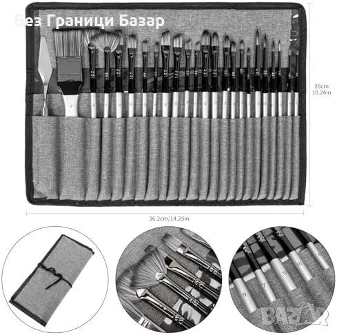 Професионален комплект 24 части за рисуване: 23 четки + палитрен нож + преносим калъф-ролка