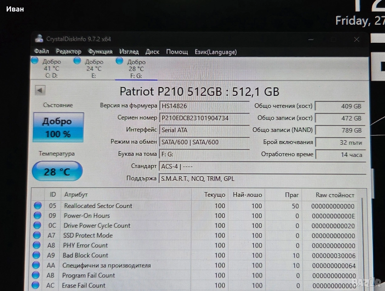 SSD диска е чисто нов с една инсталация на о.с. и бързото осъзнаване, че не е достатачен за целите. Няма документи. Има инсталиран и активиран Windows 10 Pro