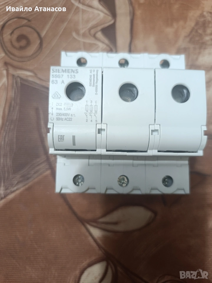 ОПИСАНИЕ: Продавам триполюсен модулен разединител за предпазители Siemens, модел 5SG7 133 от серията NEOZED. Устройството е предназначено за монтаж на DIN шина и работи със сменяеми цилиндрични вложки тип D02. Изключително надеждна защита за главни захранващи линии или индустриални машини. ТЕХНИЧЕСКИ ХАРАКТЕРИСТИКИ: • Производител: Siemens (Германия) • Модел: 5SG7 133 • Тип система: NEOZED D02 • Брой полюси: 3P (триполюсен) • Номинален ток (In): до 63A (според поставената вложка) • Номинално напрежение: 400V AC • Материал на корпуса: Висококачествена термопластмаса • Монтаж: На стандартна DIN шина (35 mm) • Степен на защита: IP20 (със затворени капачки) СЪСТОЯНИЕ: • Втора употреба, в много добро състояние. • Резбите на капачките са здрави, клемите са чисти и без следи от нагряване. • Продава се без включени стопяеми вложки (консуматив).