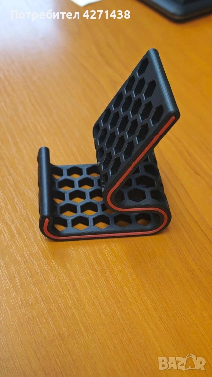 Стилна и практична поставка за телефон с модерен дизайн! Основният цвят е черно с елегантен червен кант, което я прави впечатляваща и подходяща за всяко бюро, кухня или нощно шкафче.
