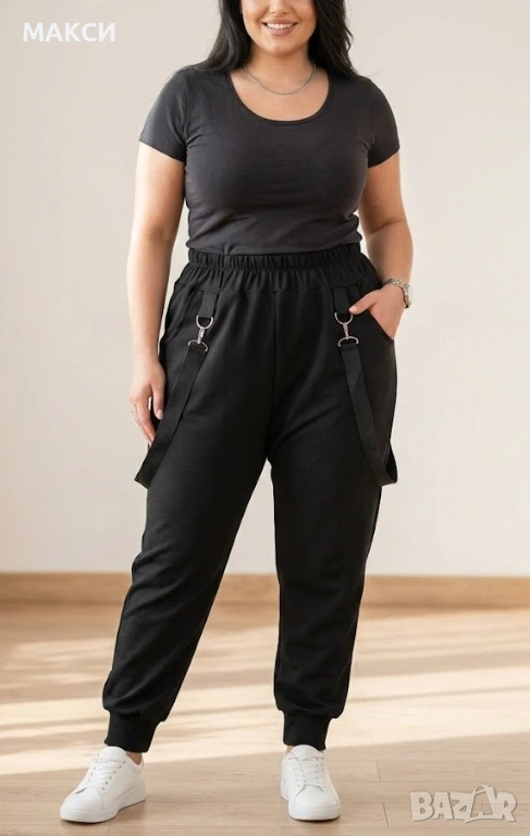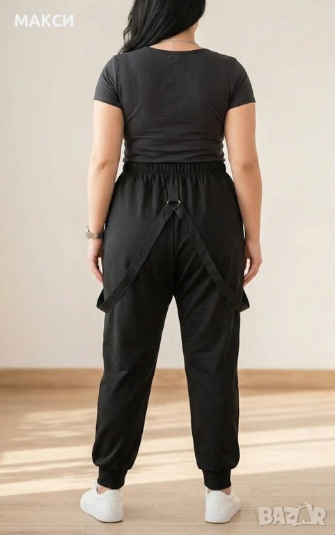 Модерно луксозно памучно еластично долнище тип потур с ластична широка висока талия + странични джобове +ефектен откачащ се страничен колан с метални елементи в наситено черно, внос Италия