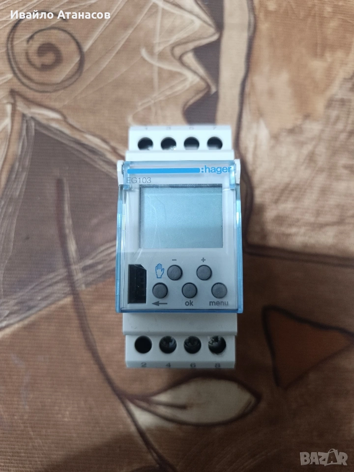 Продавам професионален цифров таймер (реле за време) Hager, модел EG103. Устройството позволява прецизно автоматизиране на консуматори (осветление, отопление, рекламни табели) с възможност за различни програми за всеки ден от седмицата. Разполага с голям LCD дисплей за лесна настройка и вградена батерия (резервна мощност), която пази настройките и часа при прекъсване на електрозахранването. ТЕХНИЧЕСКИ ХАРАКТЕРИСТИКИ: • Производител: Hager • Модел: EG103 • Тип: Седмичен дигитален таймер (7-дневна програма) • Брой канали: 1 (един превключващ контакт) • Номинален ток на контакта: 16A (AC1) • Захранващо напрежение: 230V AC • Памет: До 56 програмни стъпки (включване/изключване) • Резервна мощност (Battery backup): Да (вградена литиева батерия с живот до няколко години) • Функции: Ръчно превключване (Override), автоматично лятно/зимно часово време. • Монтаж: На стандартна DIN шина (заема 2 модула) СЪСТОЯНИЕ: • Втора употреба, в отлично техническо и визуално състояние. • Дисплеят е ясен, без избледнели сегменти. • Всички бутони за програмиране реагират коректно. • Тестван за точност на времето и превключване на релето.