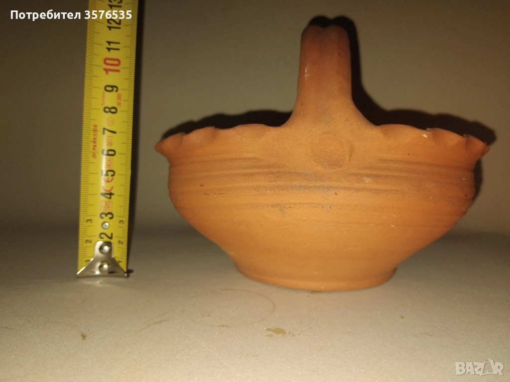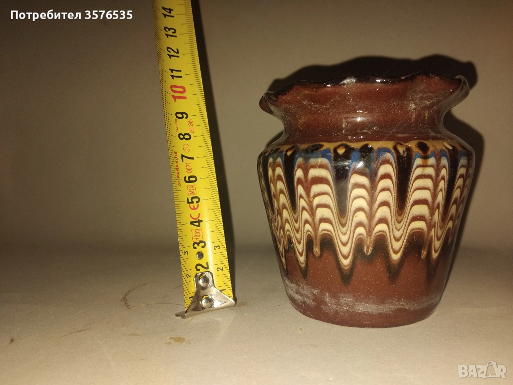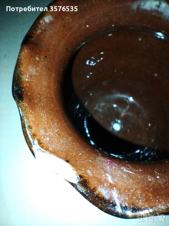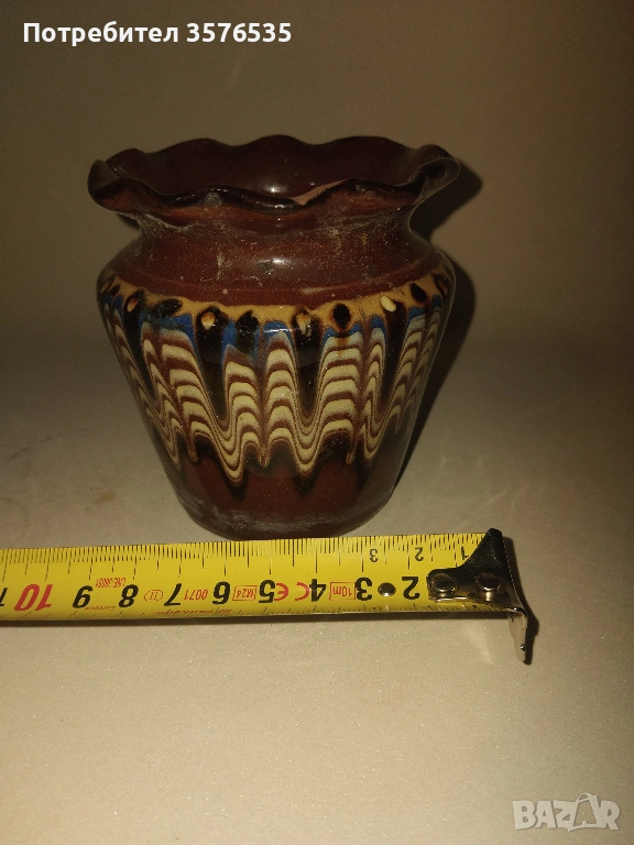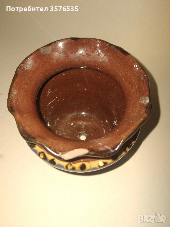 Троянска саксия: Традиционна ръчна изработка с глазура. Има леко отчупване (чип) по горния ръб, което се вижда на снимките.