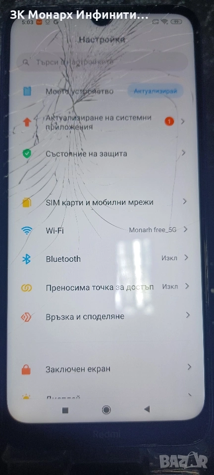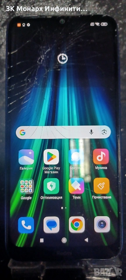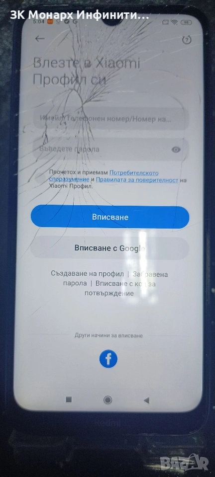 Телефонът е със спукан дисплей но си работи нормално.