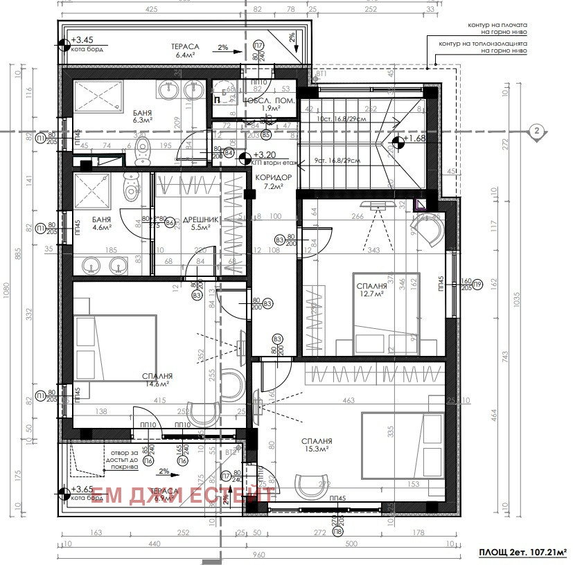 Втори етаж - три спални, като към едната има тераса, баня и тоалетна, а родителската спалня е с гардеробна, собствена баня с тоалетна и тераса с прекрасна гледка.