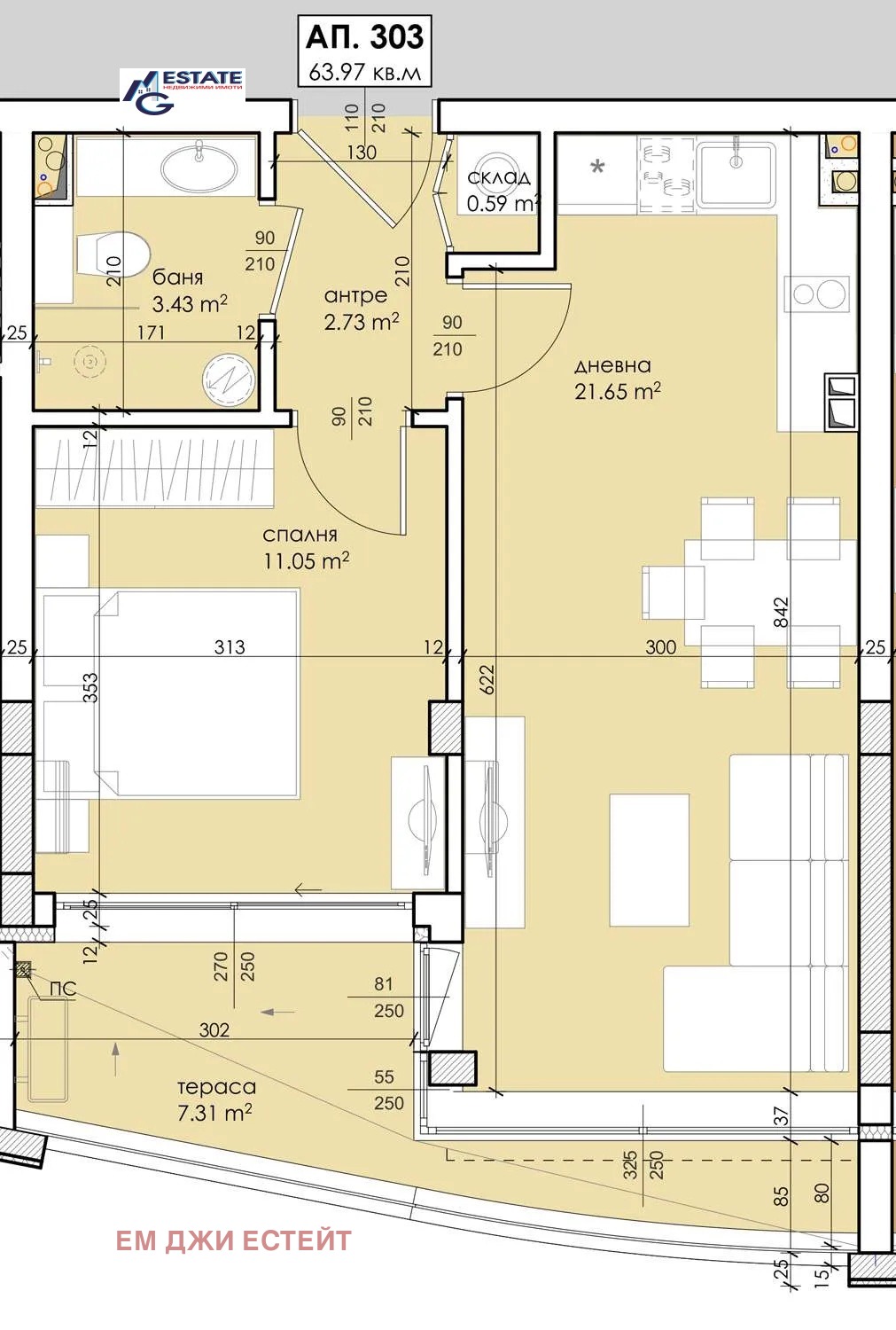 Ап. 303 изложение Юг, РЗП 63,97 кв.м.