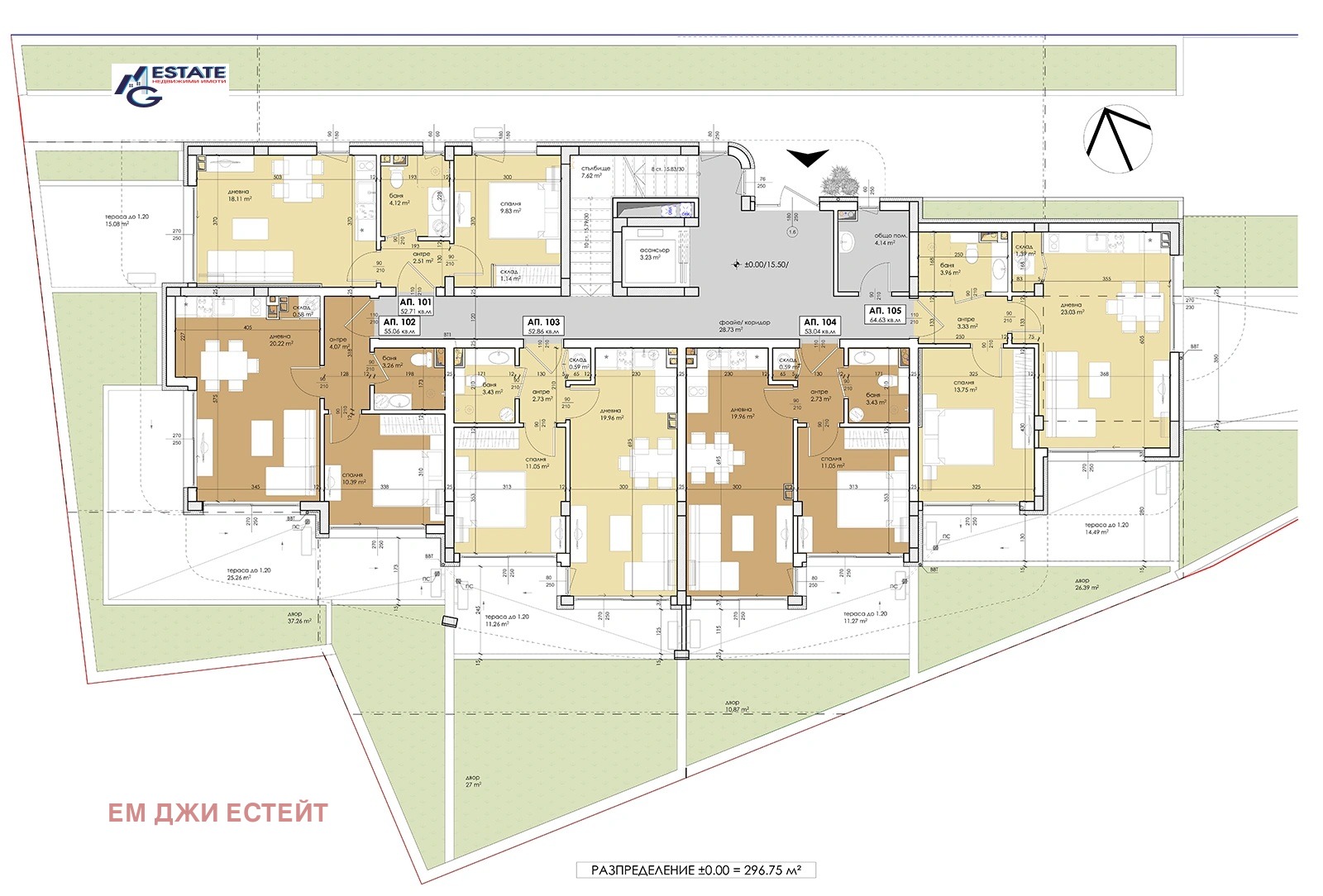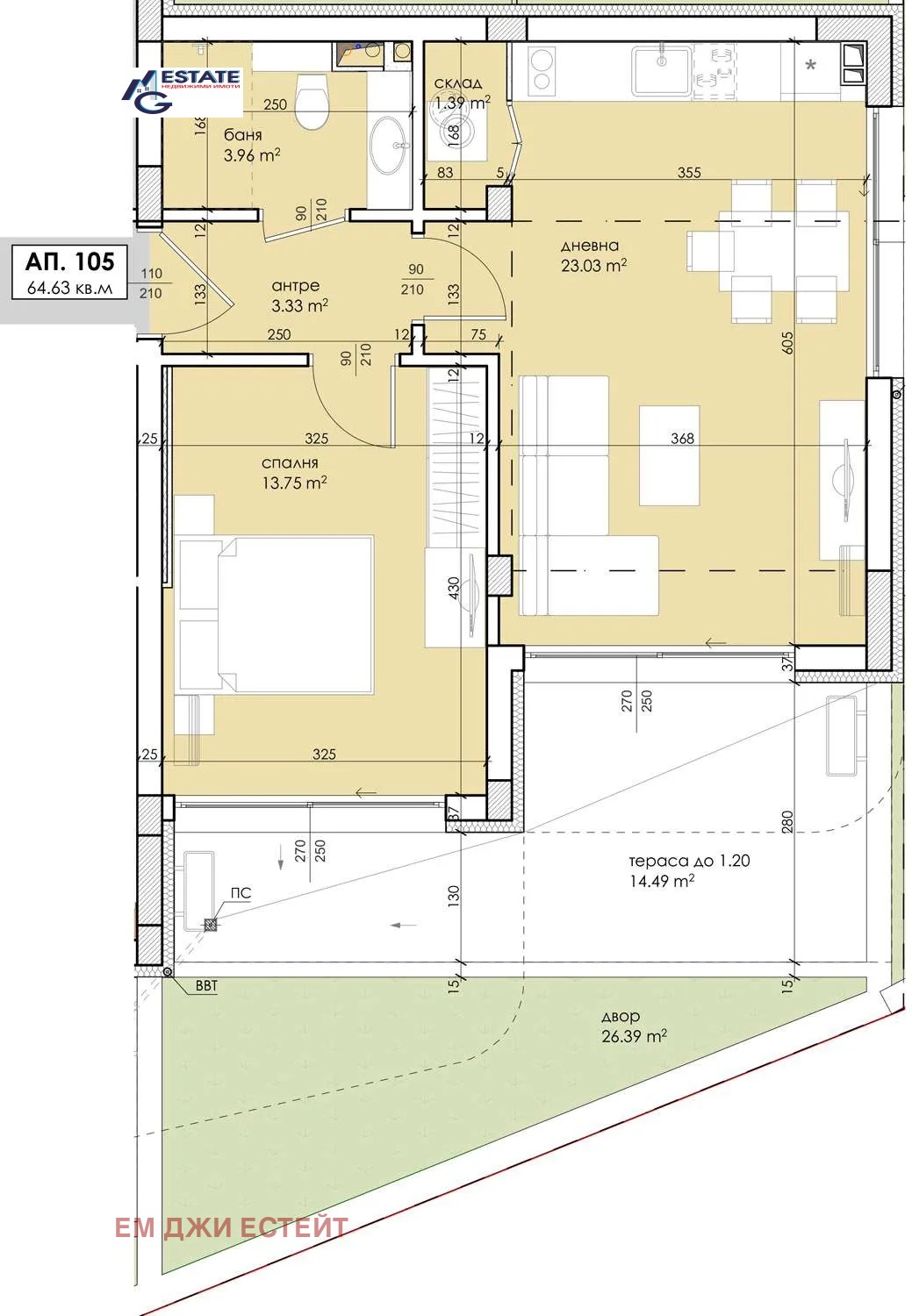 Ап. 105 РЗП 64,63 кв.м + тераса 14,49 кв.м + двор 26,39 кв.м.