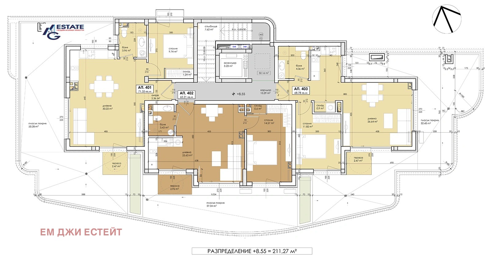 Ап. 403 изложение Юг/Изток, РЗП 68,78 кв.м, покривна тераса 38,71 кв.м. Цена: 155 000 .