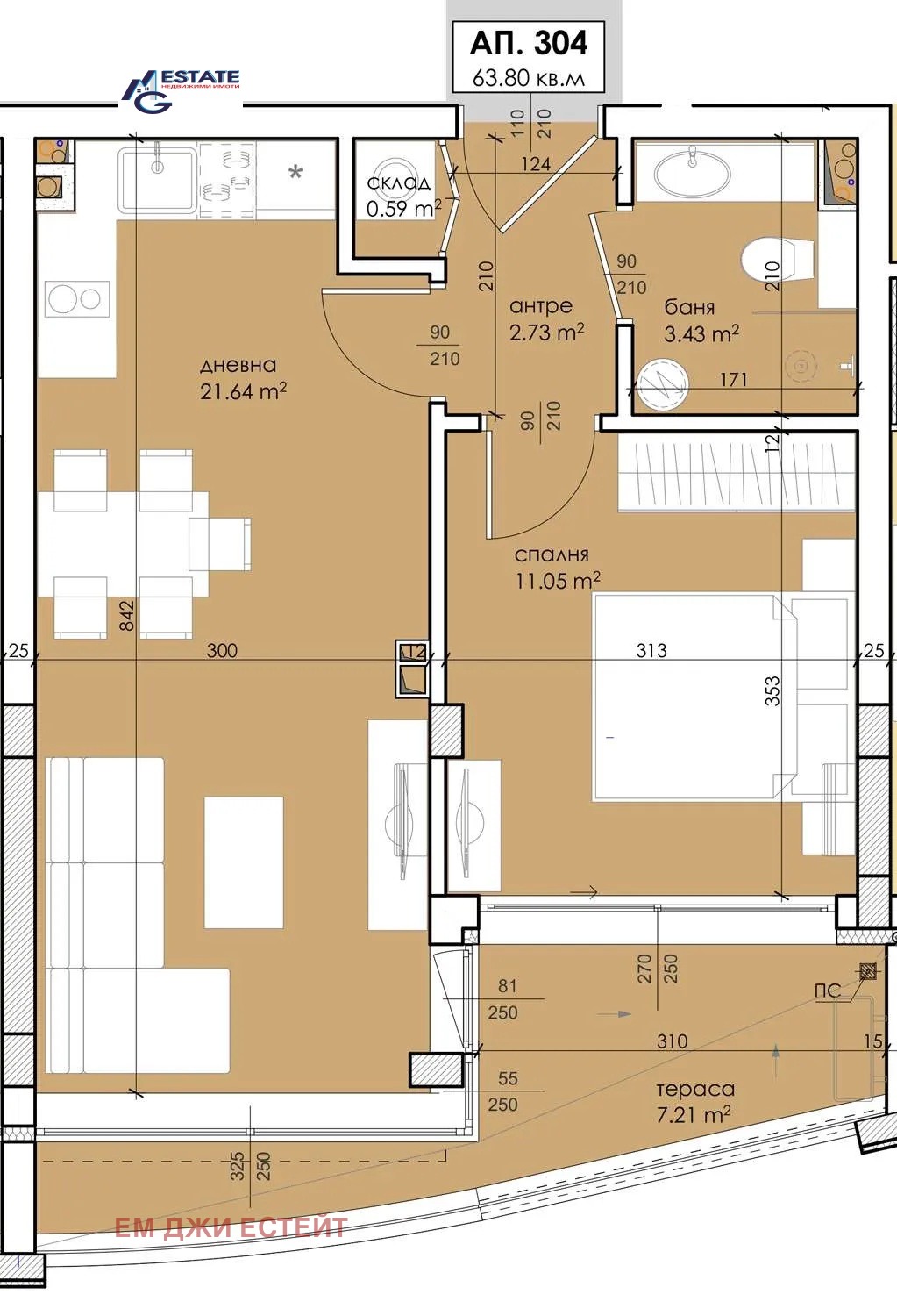Ап. 304 изложение Север/Изток, РЗП 63,80 кв.м.