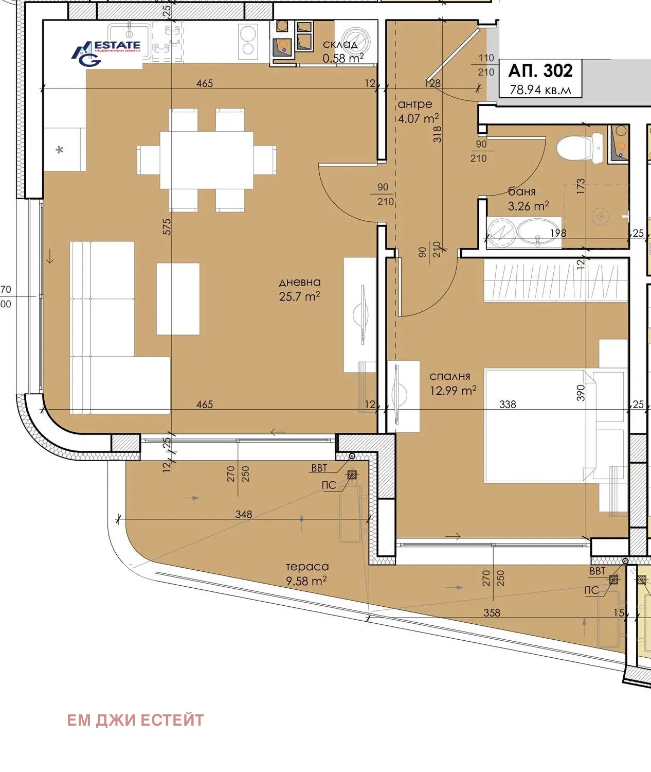 Ап. 302 изложение Юг/Запад, РЗП 78,94 кв.м.