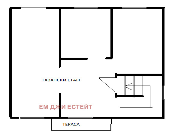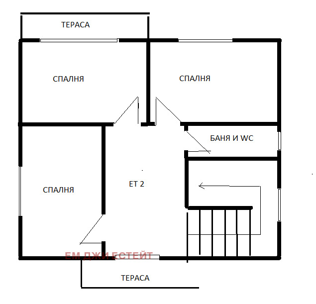 Втори етаж: Етажна площадка с тераса , три спални, едната с излаз към собствена тераса, баня с тоалетна и стълбище водещо към таванския етаж.