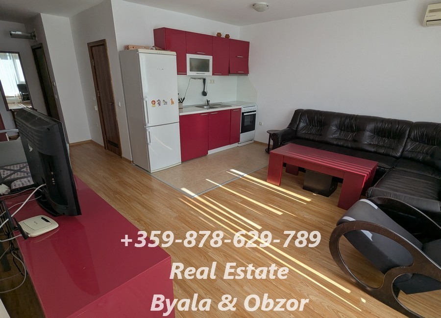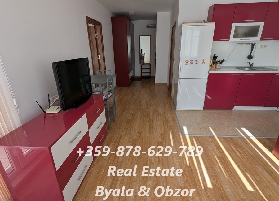 Апартаментът се състои от антре, хол с кухня в общо пространство, спалня, баня с тоалетна и тераса с красива морска панорама.