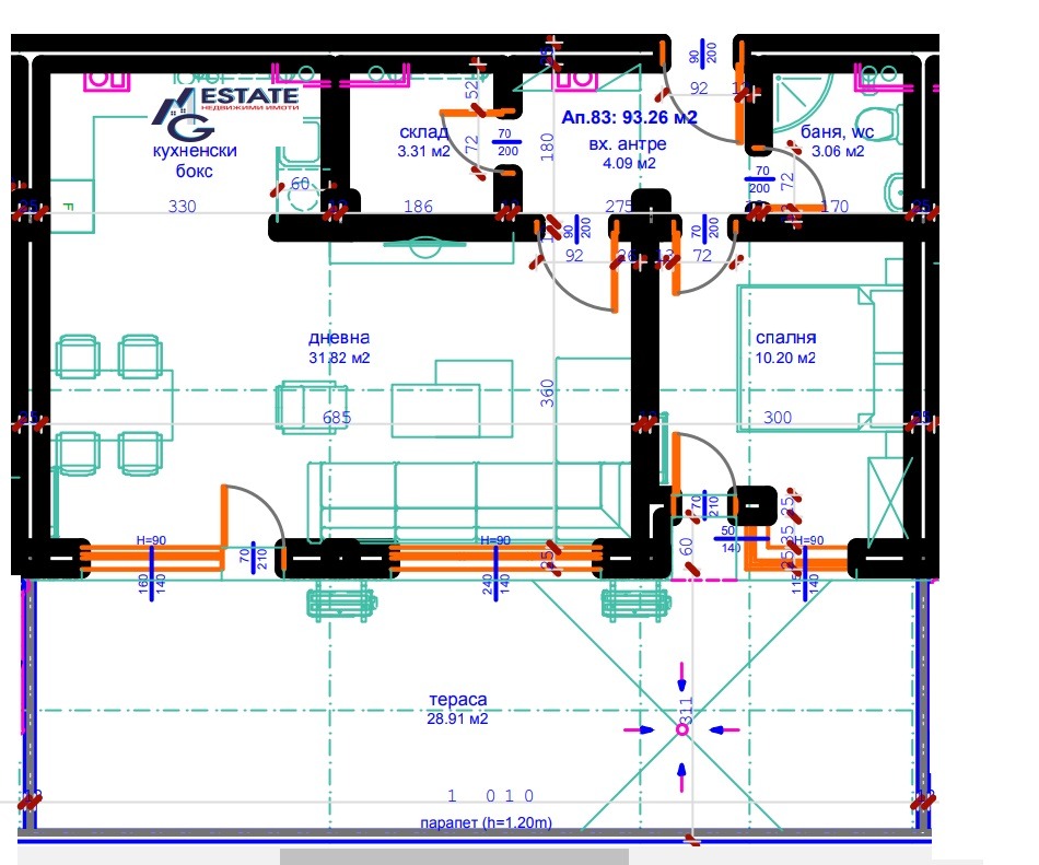Чистата площ на жилището е 92,09 кв.м., общи части 17 кв.м., обща площ - 109 кв.м.