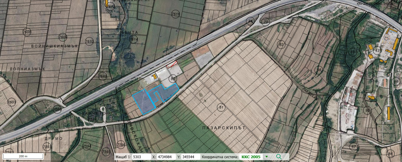 имоти с идентификатори: 34120.80.20, 34120.80.21, 34120.80.22, 34120.80.30, 34120.80.31, 34120.80.32, 34120.80.34 и 34120.80.35 са оформени като масив с площ 7827м2