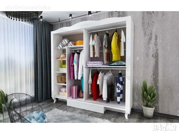 Гардероб с плъзгащи врати, огледала, три лоста за закачалки и пет рафта: 200/ 62/ Н215 см;