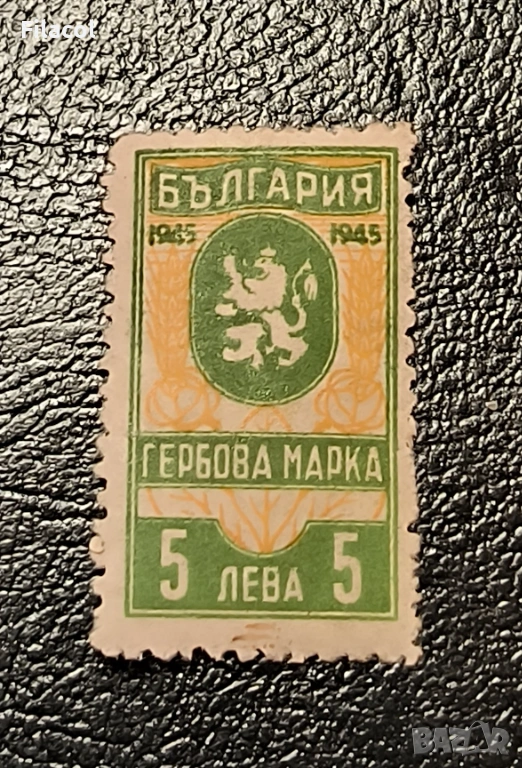 Българска гербова марка с номинал 5 лева от 1945 година. → Обява 53673377